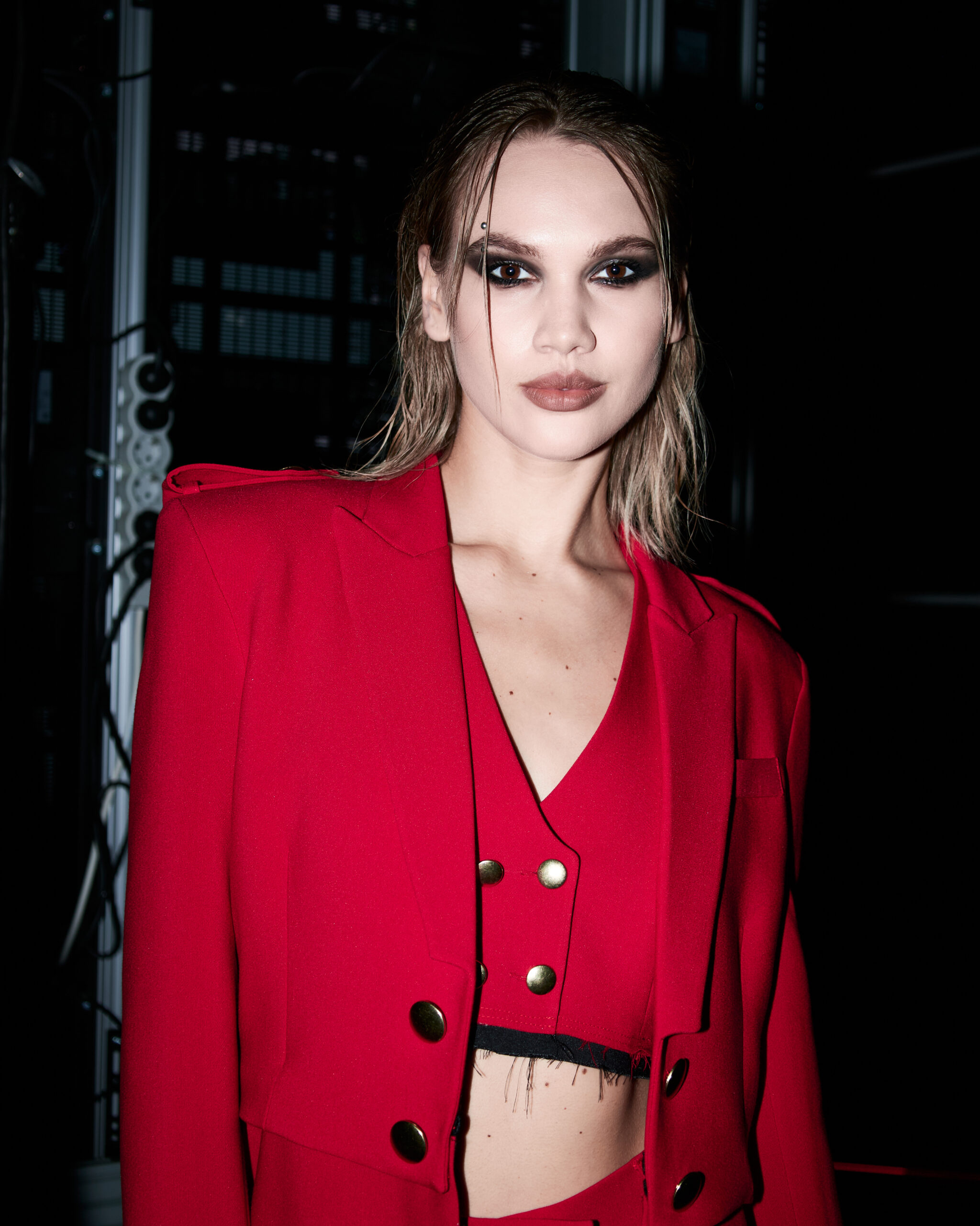 Wear it alone for a powerful statement or layered under the matching coat for a full rock-royal effect. Wear it with jeans for a day look.